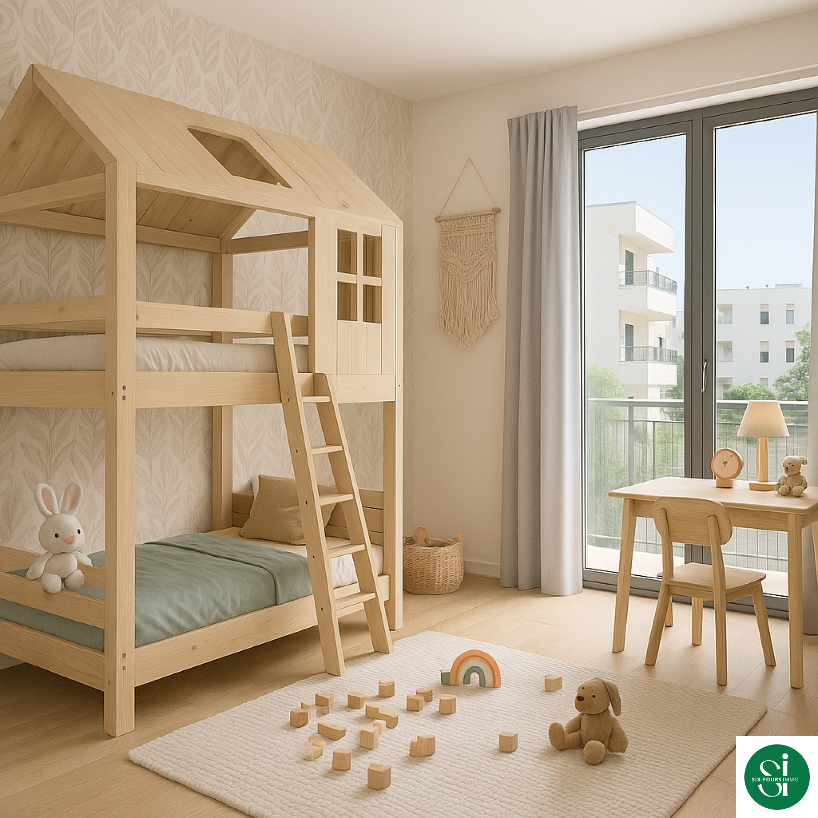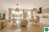 Il se compose d'un hall d'entrée, une cuisine séparée pouvant s'ouvrir sur le salon-séjour ouvrant sur un balcon exposé SUD d'environ 6.15m², un WC séparé, un dégagement avec placards desservant l'espace nuit comprenant 2 chambres avec placard, toutes deux donnant sur un second balcon d'environ 7.50m² et une salle de bains avec placard.