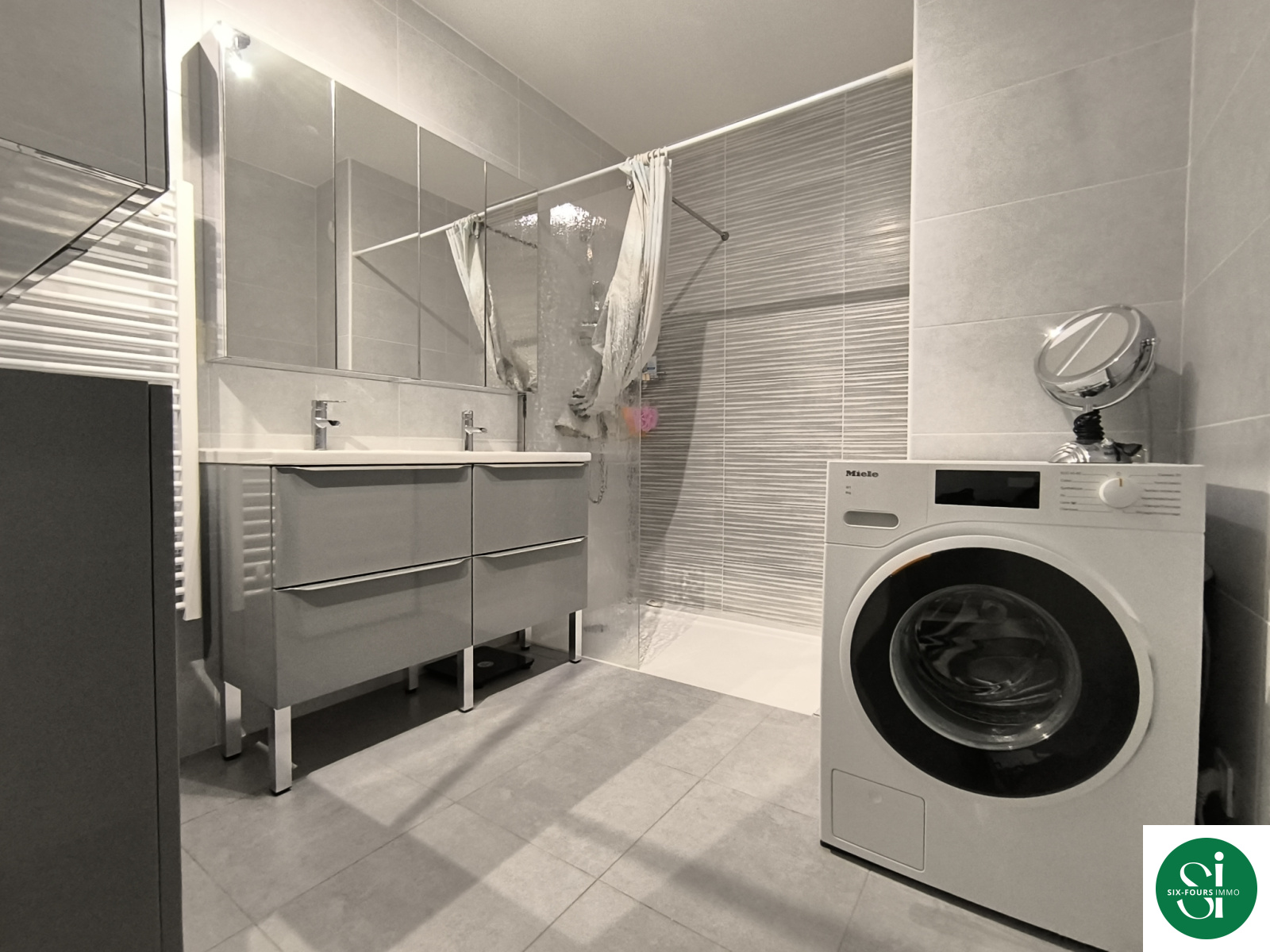 *une salle d'eau avec espace machine à laver