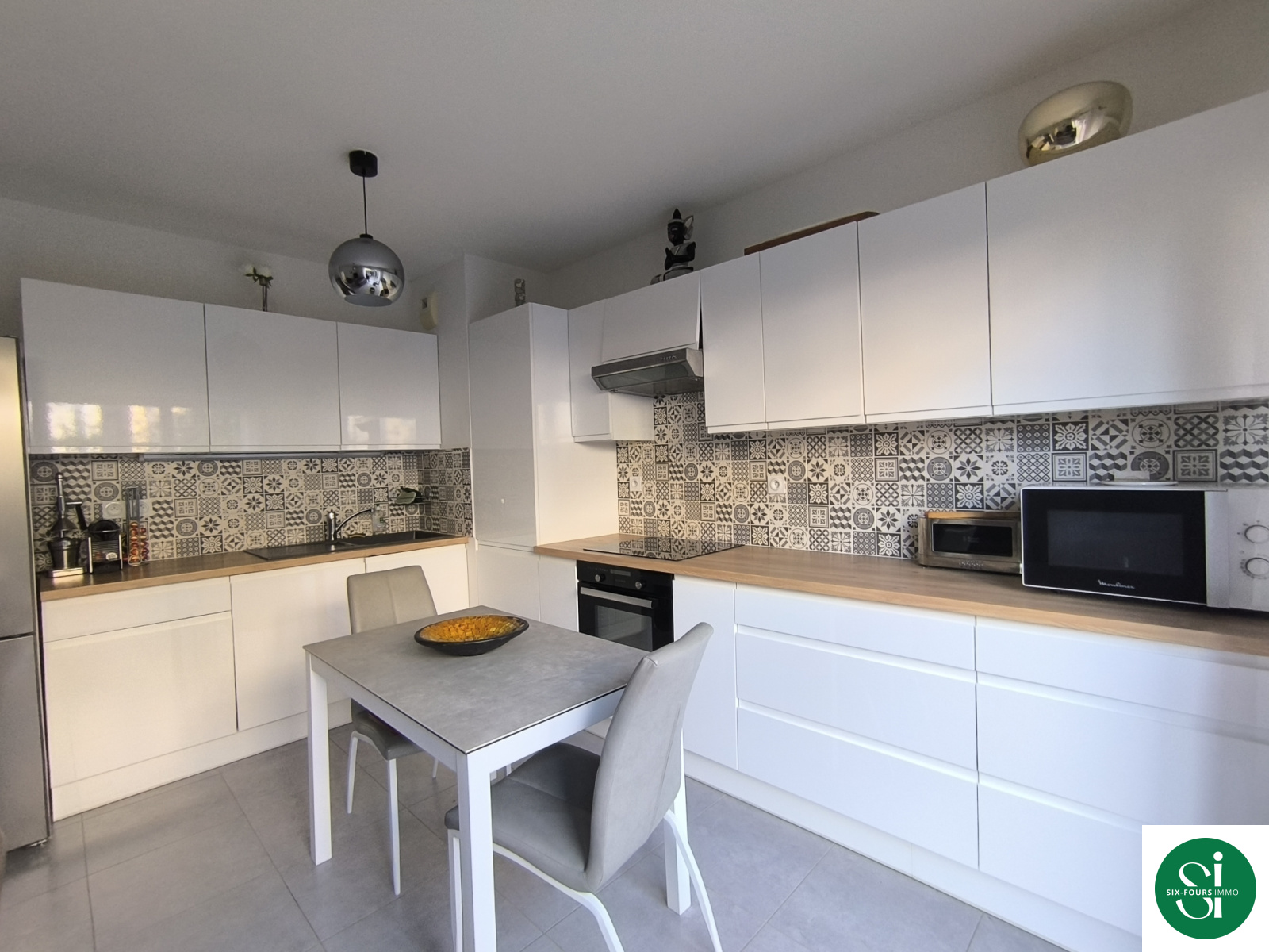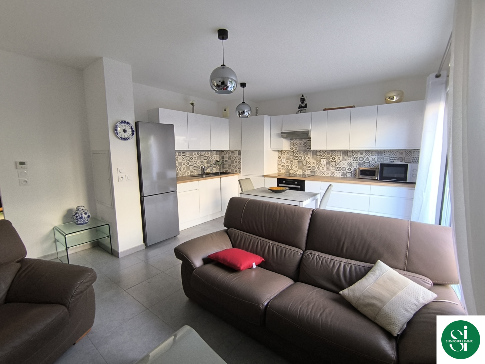 *une pièce de vie (22m²) avec cuisine ouverte aménagée et équipée, (lave-vaisselle, four, plaque, hotte)