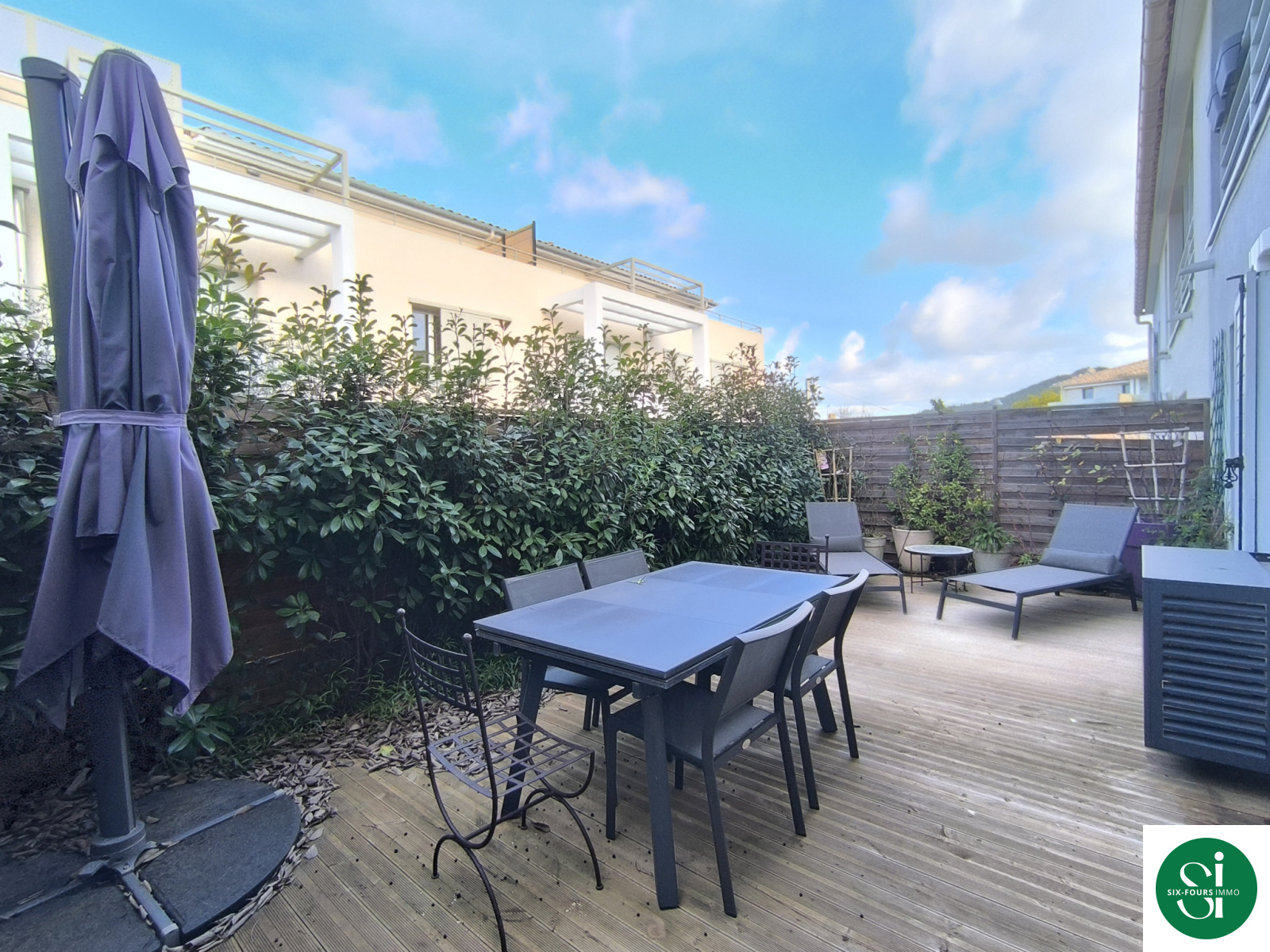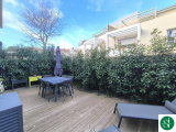*un jardin privatif d'environ 36m² exposé Sud/Ouest, accessible depuis le séjour et une chambre (vis-à-vis léger, facilement atténuable)