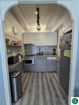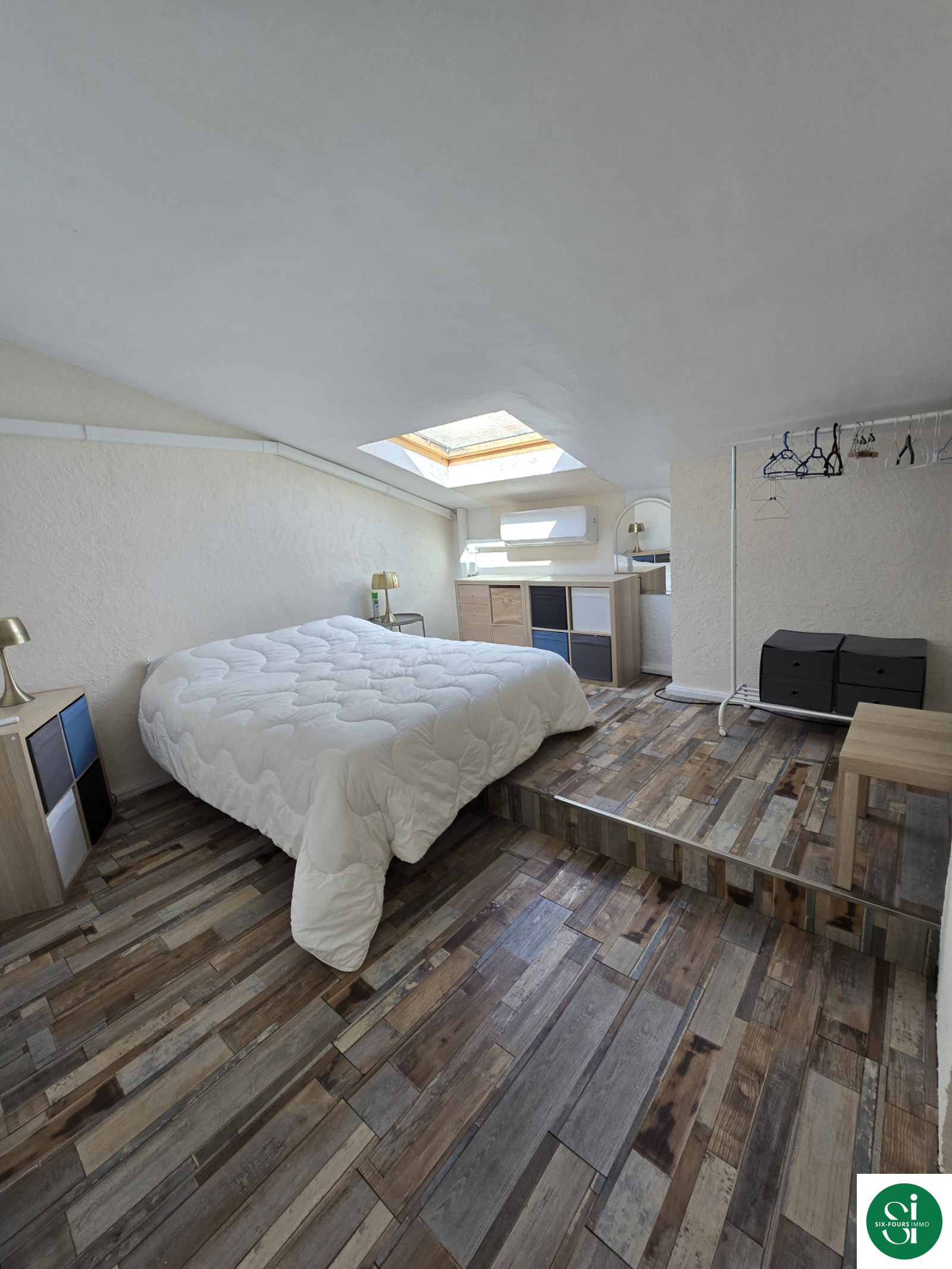 Celui ci est composé d'une entrée avec rangements, d'une cuisine aménagée ouverte sur le sur séjour donnant sur un balcon avec vue sur le jardin paysager et la piscine, une salle d'eau avec des W.C., à l'étage: une chambre et un coin nuit.