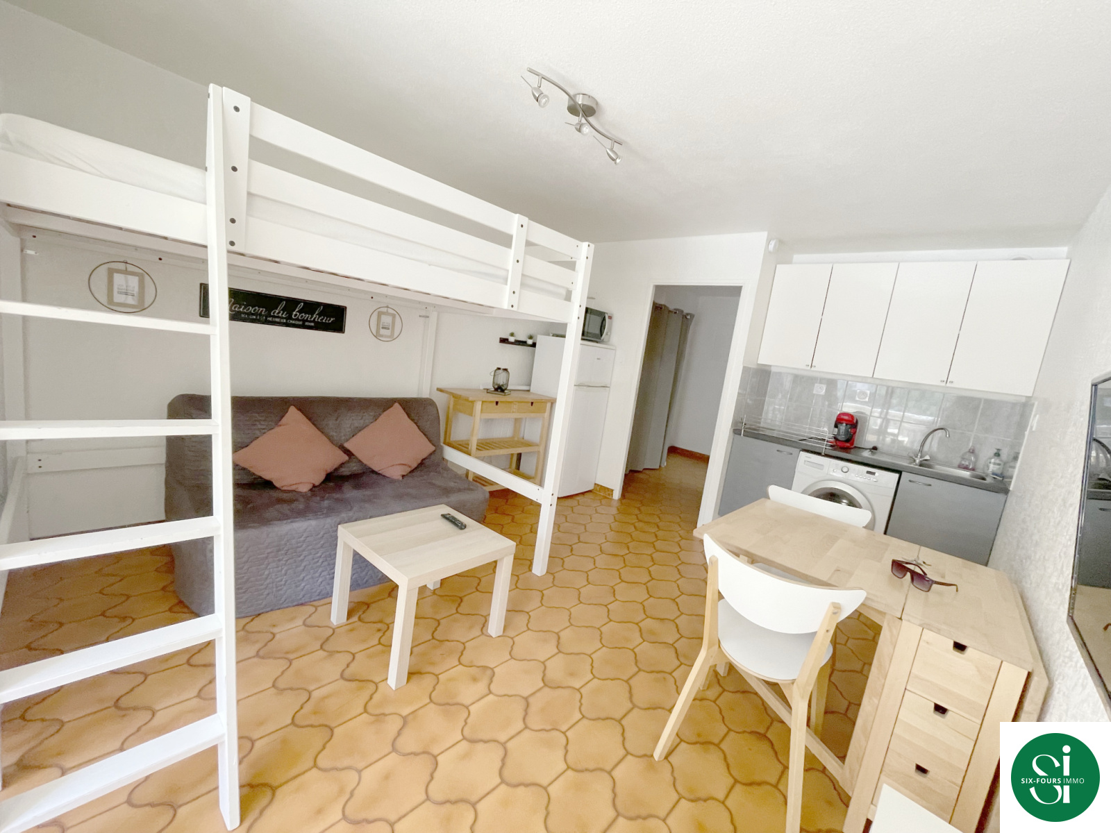Comprenant , un hall d'entrée avec emplacement pour lits couchettes , une salle d'eau à l'italienne avec wc , une lumineuse pièce de vie avec salon-séjour - cuisine us aménagée donnant sur une loggia ouverte de plus de 7m2 .